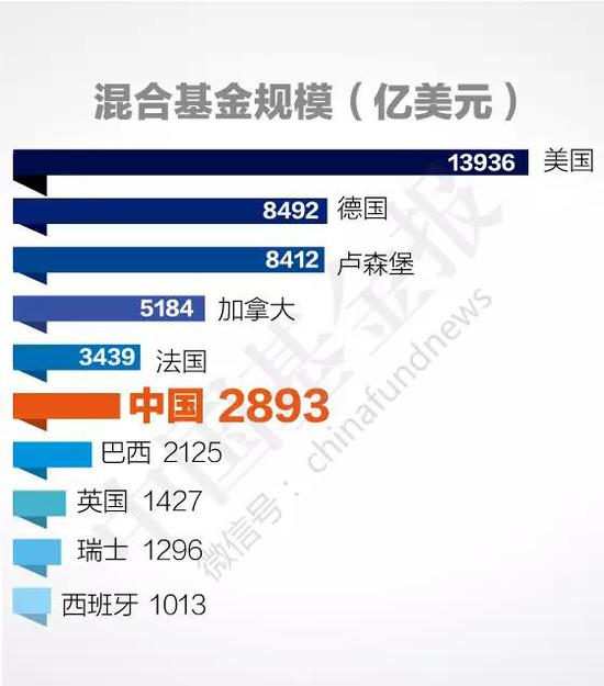 据统计,中国开放式混合基金2016年年底规模排名全球第6,资产规模为2892亿美元,超过了英国、巴西等国家的混合基金规模,在美国、德国、卢森堡、加拿大和法国之后。