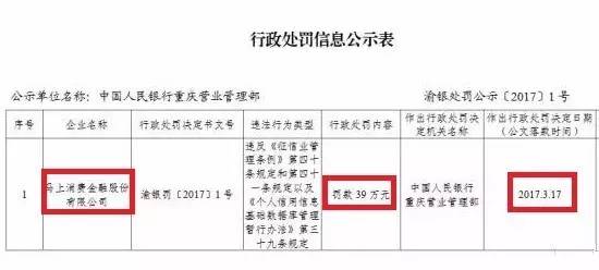 2017年以来,首先被曝光的消费金融罚单来自于重庆,央行重庆营业管理部的处罚公告【2017】1号就是处罚“马上消费金融股份有限公司”的。