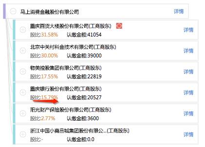 据悉,马上消费金融股份有限公司是一家非银行控股的大型消费金融公司,第一大股东为上市公司重庆百货,第四大股东为重庆银行,其他股东还包括中关村科金技术公司、物美控股集团等。