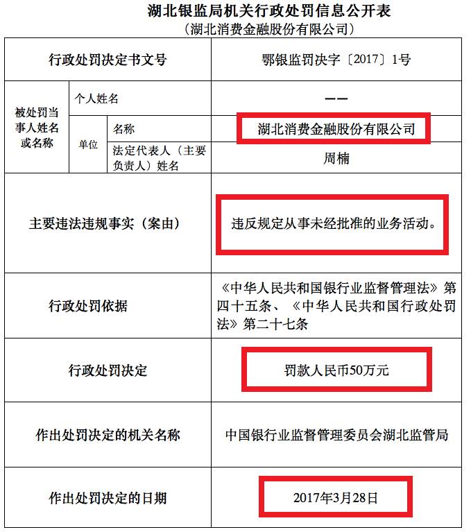 第二家受罚的消费金融公司是总部设在武汉的湖北消费金融股份有限公司,来自湖北银监局的【2017】1号处罚决定书显示,该公司因违反规定从事未经批准的业务活动,而被处罚人民币50万元,处罚决定日期为2017年3月28日。