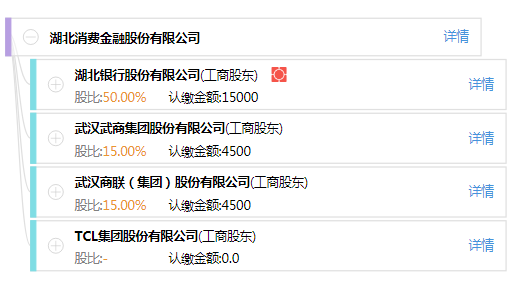 不同于重庆的马上消费金融公司,武汉的湖北消费金融公司是由银行控股的,湖北银行占50%股权,认缴金额为1.5亿元,其他股东包括武商集团等公司。
