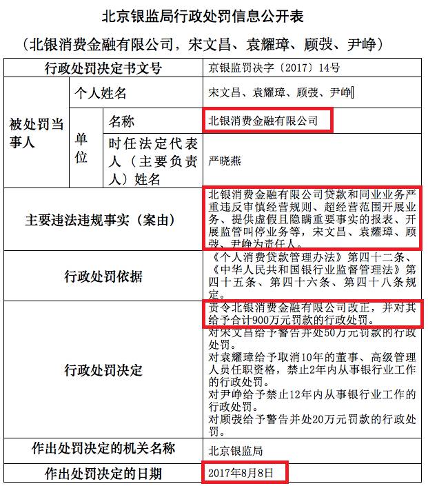 处罚信息显示:北银消费金融有限公司贷款和同业业务严重违反审慎经营规则、超经营范围开展业务、提供虚假且隐瞒重要事实的报表、开展监管叫停业务等,宋文昌、袁耀璋、顾弢、尹峥为责任人。