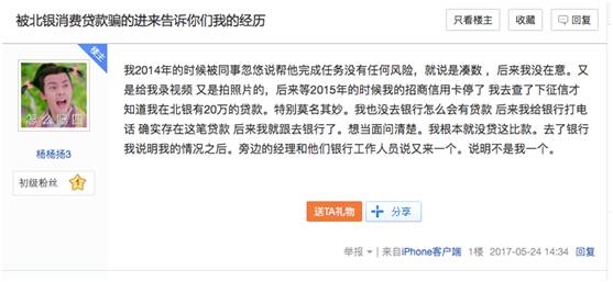 从超经营范围开展业务来看,此前北银消费金融被报道出拉人头骗贷款的新闻,直到近期,百度贴吧上仍有人发出被骗经历。