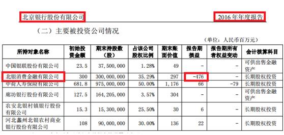 北京银行2017年半年中并未披露北银消费金融的盈利,2016年年报中有所披露。北京银行持有的北银消费金融股权在2016年全年损失了4.76亿元,按35.29%的股权测算,北银消费金融公司2016年全年亏损约13.5亿元。