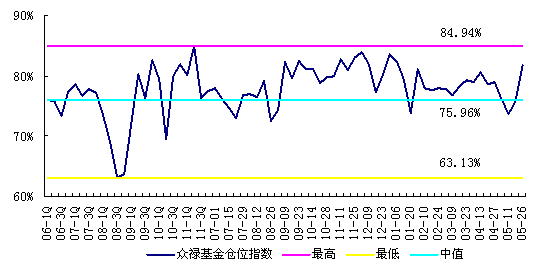 众禄基金研究中心仓位测算的结果显示,上期(2012-05-18~2012-05-25)样本内开放式偏股型基金(包括股票型基金和混合型基金,剔除QDII和指数型基金)平均仓位自前一期的75.84%上升6个百分点至81.84%。其中,股票型基金平均仓位为86.63%,较前期上升5.92个百分点;混合型基金平均仓位为73.91%,较前期上升6.13个百分点。