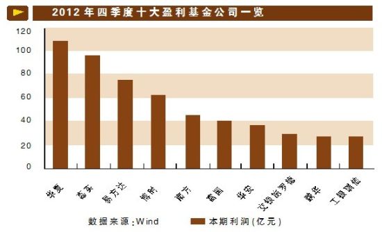 而盈利垫底的十大公司中,除了天弘基金、益民基金和金元惠理基金以外,其余七席均被次新基金公司占据。这些公司去年四季度的利润水平均低于5000万元。由于次新基金公司利润总额跟净值增长率不同,除了与业绩挂钩外还与规模相关,次新基金公司通常体量较小,难免沦落榜尾。