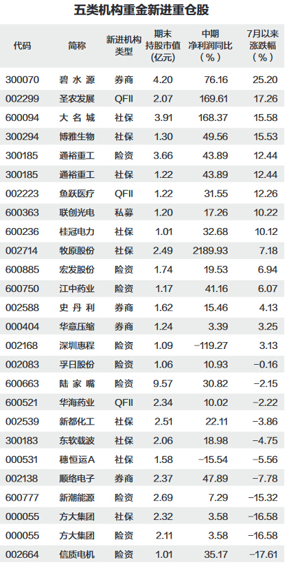 QFII私募等五类机构上半年重金新进24只重仓股
