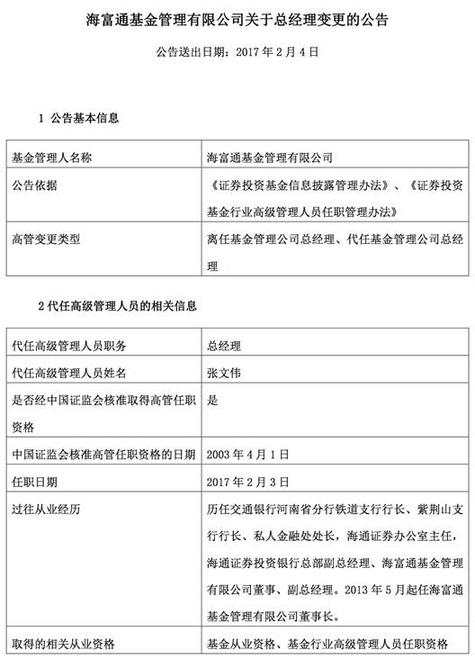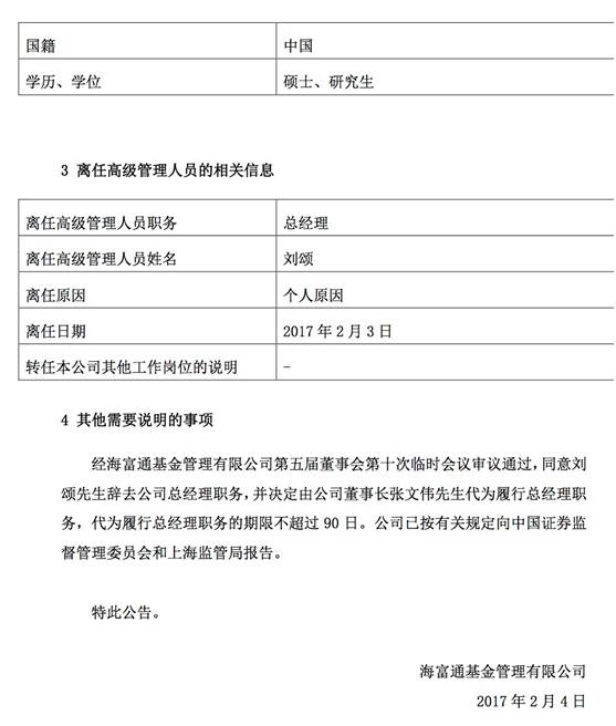 据海富通基金昨日晚间在深交所网站发布的公告信息显示,总经理刘颂因个人原因离任,由董事长张文伟代任总经理职务。
