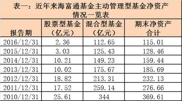数据显示,截至2016年12月31日,海富通基金管理的主动管理型基金规模合计115.01亿元,总体占比不足三成,其中,股票型基金的规模仅为2.36亿元,滑落至历史低点,混合型基金的规模为112.65亿,大幅低于近七年的历史规模均值的197亿元。