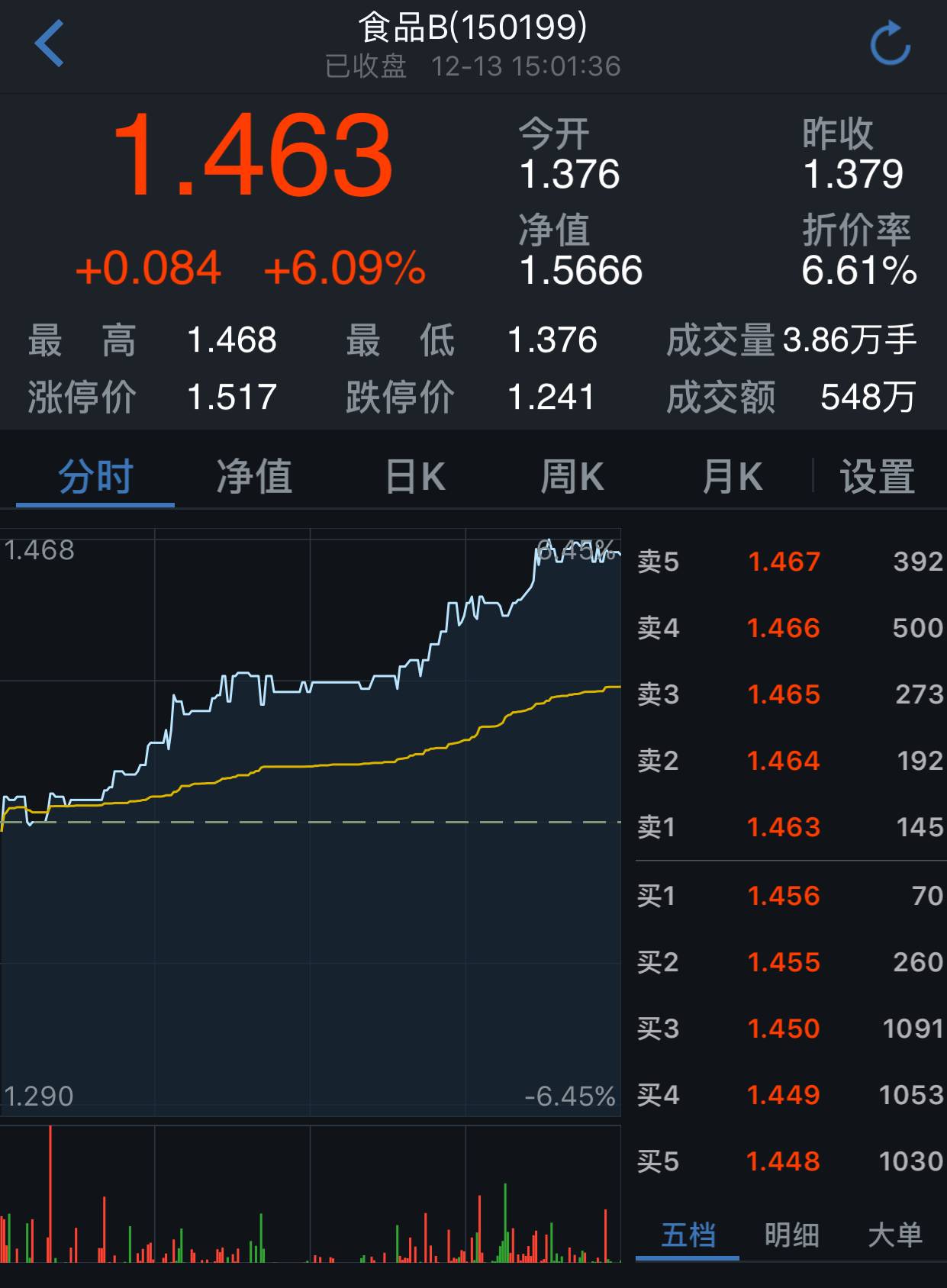 此外,整个食品板块今日也保持震荡上行,除了白酒以外,如益生股份上涨6.68%,上海梅林上涨5.46%,伊利股份也大涨了3.76%。受此影响,国泰国证食品饮料B(简称食品B)今日大涨6.09%。