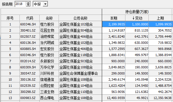 从加仓情况来看。今年上半年,社保基金累计加仓恒力股份1599.98万股,成为加仓股数最多的公司;花园生物和涪陵榨菜,则以810.11万股和642.38万股的加仓股数,位列其后。