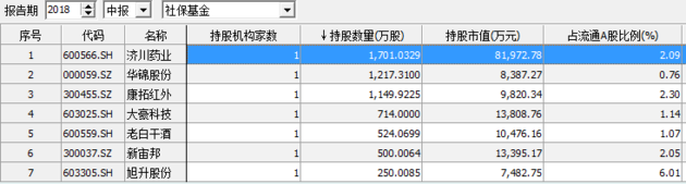据wind数据统计,截至8月1日,社保基金今年上半年新进多只个股,其中,济川药业成为社保基金新进股数最多的公司,全国社保基金406组合今年上半年买入1701.03万股,持仓市值为8.2亿元,占流通股比例为2.09%。