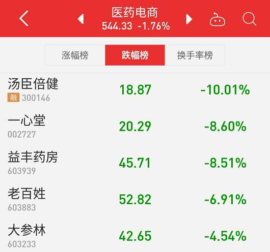 在细分板块来看,医药电商板块早盘跌幅巨大。截至上午收盘,汤臣倍健跌停,一心堂、益丰药房等下跌均超8%。
