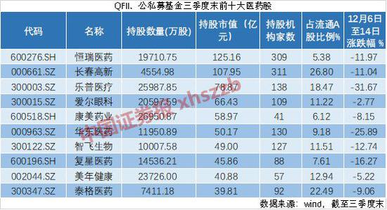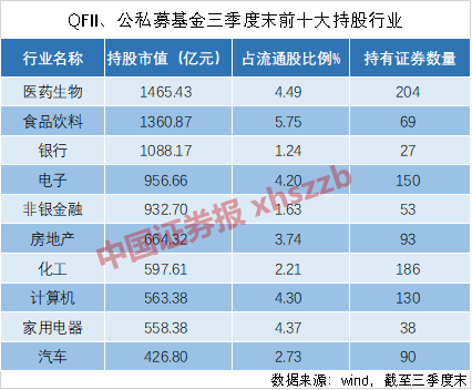 从三季报数据看,医药生物板块是QFII、公募、私募基金的第一大重仓行业,持股市值合计达1465.43亿元,占流通股比例为4.49%。