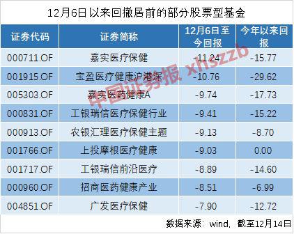重仓股的下跌自然令相关基金净值大幅回撤。Wind数据显示,12月6日以来,股票型基金中医药方面的基金净值回撤居前。在不到两周时间内,部分基金净值回撤超过10%,嘉实医疗保健净值回报为-11.24%,宝盈医疗健康沪港深净值回报为-10.76%。上投摩根医疗健康在12月5日收盘时年内回报尚有9.93%,但也在最近的下跌中抹去了全年涨幅。