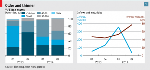 (上面左图为各季度的余额宝资产不同期限资产的比例;右图蓝线为余额宝资金流入金额,褐线为余额宝投资产品的平均期限)