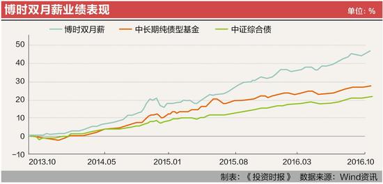 自2013年10月22日成立至今年三季度末,博时双月薪总回报达44.97%,其中2014年、2015年收益率分别为16.01%、16.19%,回报稳定。过去一年、两年期业绩均高居银河同类排名第1。