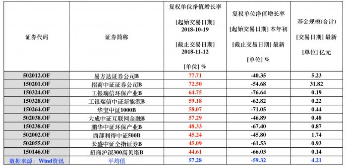 自10月19日至11月12日,单位净值涨幅最多的前十大基金依次是:易方达证券公司B、招商中证证券公司B、工银瑞信环保产业B、工银瑞信中证新能源B、华宝中证1000B、大成中证互联网金融B、鹏华中证环保产业B、西部利得中证500B、长盛中证全指证券B和招商沪深300高贝塔B。