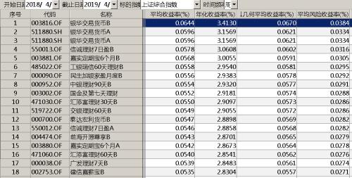 2018年4月9日至2019年4月9日主要货币基金收益排名情况。数据来源wind