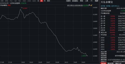 余额宝自2017年8月份至2019年4月10日的7日年化收益率走势图。数据来源wind。