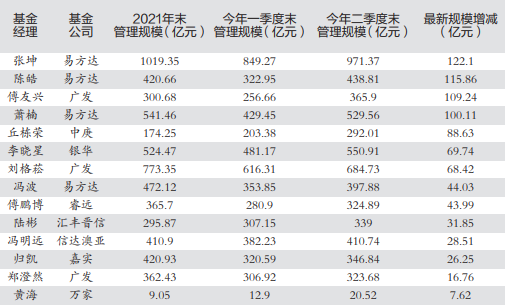 部分顶流基金经理的管理规模变动情况
