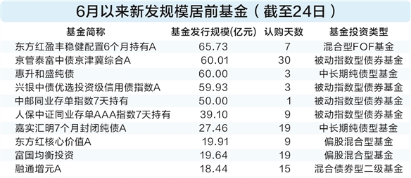 具体来看,截至6月24日,22只新发债券型基金募集了432.85亿元,成为当月募集规模最大的产品,发行规模占比达到47.63%,单只平均规模19.68亿元。其中,两只政策性金融债指数基金——京管泰富中债京津冀综合A和惠升和盛纯债,分别募得60.01亿元和60亿元。值得注意的是,惠升和盛纯债仅用3天即完成募集,显示机构资金对优质纯债产品的配置需求迫切。