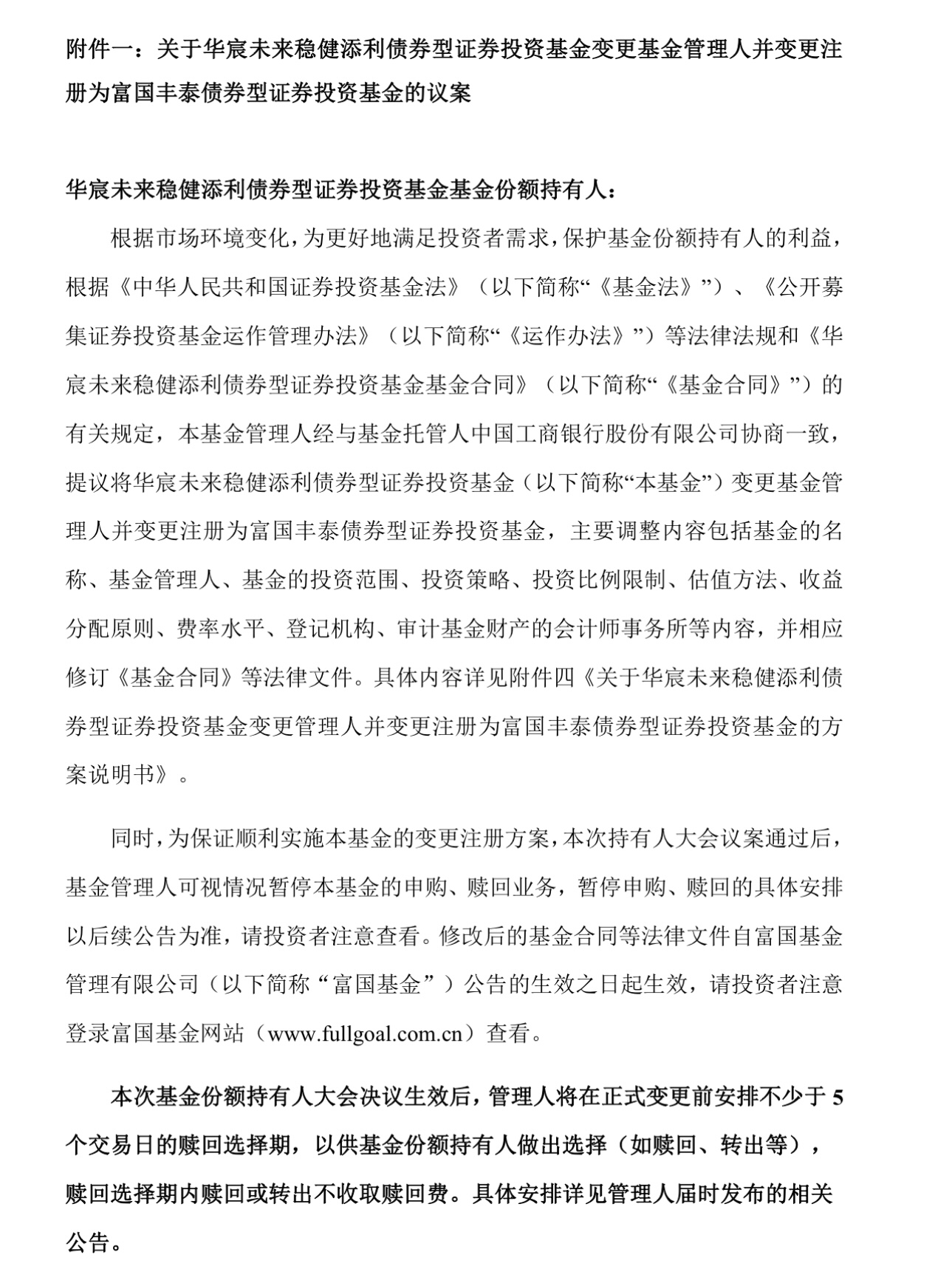 附件内容显示,根据市场环境变化,为更好地满足投资者需求,保护基金份额持有人的利益,根据有关规定,该基金管理人华宸未来基金经与基金托管人工商银行协商一致,提议将华宸未来稳健添利债券型证券投资基金变更基金管理人并变更注册为富国丰泰债券型证券投资基金。主要调整内容包括基金的名称、基金管理人、基金的投资范围、投资策略、投资比例限制、估值方法、收益分配原则、费率水平、登记机构、审计基金财产的会计师事务所等内容,并相应修订基金合同等法律文件。