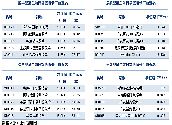 受此影响,金牛理财网偏股型基金指数上涨2.56%,主动偏股型基金指数上涨2.38%。指数股票型基金指数上涨3.13%。具体看来,关注中小企业及互联网金融概念基金涨幅较大。中证500工业指数、广发百发100指数A、广发百发100指数E分别上涨4.24%、4.21%和4.1%。主动股混型基金中关注环保概念及医药、电子行业的混合型基金涨势较好,金鹰核心资源混合、博时行业轮动混合和华泰柏瑞创新升级混合分别上涨5.45%、5.42%和5.12%。