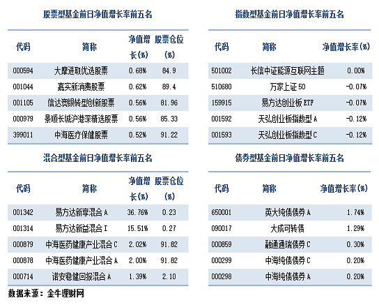 受此影响,金牛理财网偏股型基金指数下跌0.7%,主动偏股型基金指数下跌0.49%。指数股票型基金指数下跌1.33%。具体来看,跟踪能源行业的指数型基金跌幅居前。上证能源交易型指数发起、广发中证全指能源和汇添富中证能源ETF分别下跌3.42%、3.39%和3.37%。主动股混型基金中,关注医药行业和遭遇赎回的混合型基金涨幅居前,易方达新享混合A、易方达新益混合I和中海医药健康产业混合C分别上涨36.76%、15.51%和2.02%。