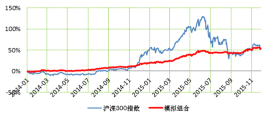 当然,若不进行黄金趋势性交易,从资产配置的角度而言,在整体资产组合中增加5%~10%的黄金资产也是符合国际惯例的投资方案。根据历史数据回测,通过大类资产配置设定投资组合,假定组合的目标风险设定年化波动率为8%,根据标的资产的历史波动率变化情况,进行相应的资产类别权重调整,最终实现组合稳健增长。截至2015年11月底,模拟组合的年化收益率为25%,年化波动率为7.8%,夏普比率为3.2,远远优于沪深300的夏普比率1.1。其中黄金资产与美元资产平滑了部分A股波动。