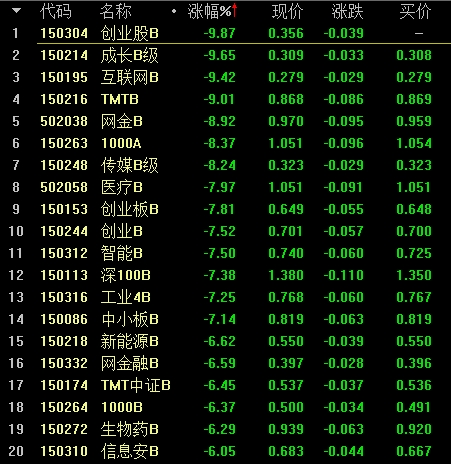 据集思录数据,目前共有6只分级B需警惕下折风险。以母基金再跌10%为阀值来看,互联网B、成长B级、可转债B、转债B级、传媒B级以及创业股B如果今日再跌,下折风险将继续加大。