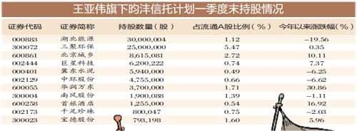 梳理刚刚披露的一季报可以发现,王亚伟管理的昀沣信托计划今年3月末重仓持有11只股票,其中持股超过千万股的有湖北能源和三聚环保。这两只股票堪称是左右互搏的典范,湖北能源作为湖北省省属能源公司,火电发电是其营收的重要来源,而三聚环保主营脱硫催化剂和净化剂应用,主要服务于石油炼化、煤化工等领域。从市场表现来看,它们今年以来分别累计下跌了19.56%和上涨了0.35%。