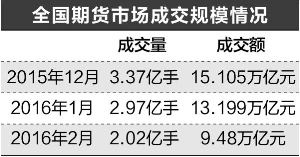 中国期货业协会最新数据显示,2月份全国期货市场交易规模环比有所下降,以单边计算,当月全国期货市场成交量2.02亿手,成交额9.48万亿元,同比分别增长26.57%和下降64.33%,环比分别下降31.98%和28.19%。
