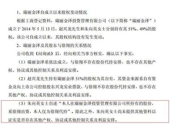 而朱向英则自述,“本人在瑞丽金泽投资管理有限公司所持有的股份,系徐翔出资,本人仅为徐翔代持”。除此之外,朱向英尚未提供其他资料以证实是否存在其他产权、协议或其他控制关系及利益安排。