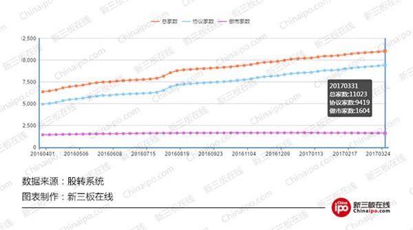 而一年前(2016年4月1日),在整体新三板挂牌企业只有6361家的时候,当时采取做市转让的企业数是1421家,占比达22.34%。