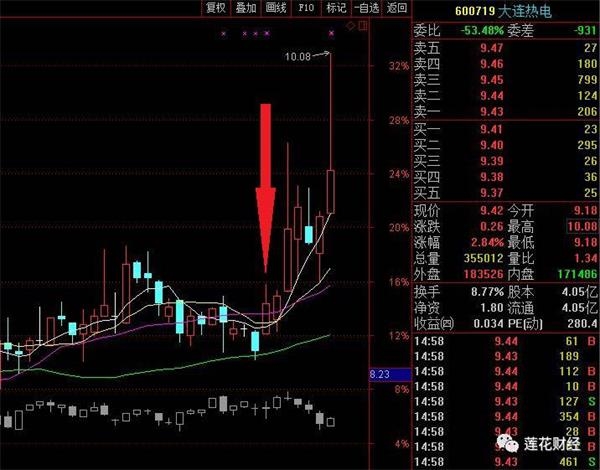 一是叠加了和大盘的对比,最下面灰色的K线是沪指的同期走势,由此可以看出,大连热电近期是逆市上涨的,走势显得相当霸气。