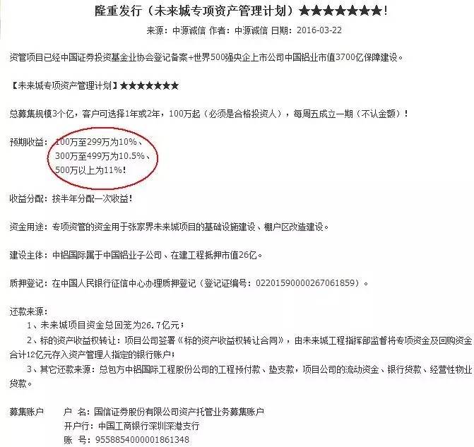 具体事情是这样的,今年3月初有投资者发现,去年2月5日购买的未来城专项资产管理计划并没有按期兑付,经过打听才知道管理人中源诚信相关负责人已经处于失联状态。据了解,该资管计划募资规模3亿,但现在到期未兑付的资金有1.9亿,约有19名持有人投资到期未兑付。