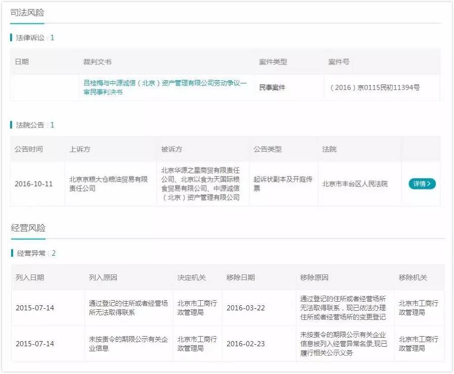 再看该公司的工商注册信息,实际上也是问题多多。该公司涉及1个f法律诉讼(吕桂梅与中源诚信(北京)资产管理有限公司劳动争议一审民事判决书)、1个法院公告(被北京京粮大仓粮油贸易有限责任公司起诉),还有2个经营异常信息(通过登记的住所或者经营场所无法取得联系、未按责令的期限公示有关企业信息),存在司法风险和经营风险。