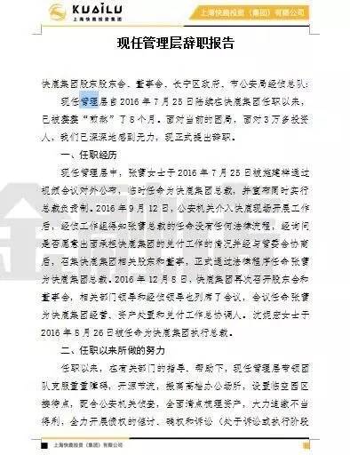 辞职报告称,截至2017年3月22日,快鹿已兑付7亿多元,公司现金流已经枯竭,兑付被迫停止……现任管理层自2016年7月25日陆续在快鹿集团任职以来,已被整整“煎熬”了8个月。面对当前的困局,面对3万多投资人,管理层已深深地感到无力,因此郑重正式提出辞职。