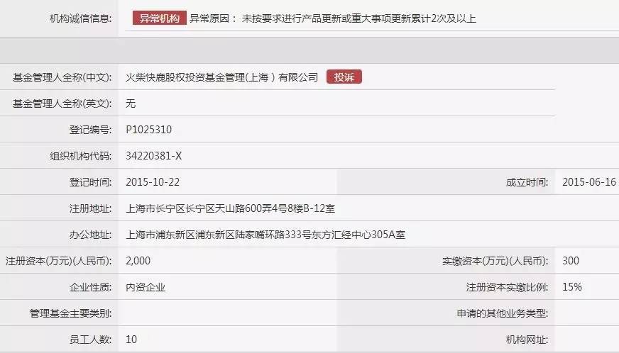 火柴快鹿的备案登记信息显示,该公司目前已被协会列入异常机构,原因是未按要求进行产品更新或重大事项更新累计2次及以上。该公司注册资本为2000万元,实缴资本为300万元,实缴比例为15%。公司的6名高管,只有2名具备基金从业资格,法定代表人毛玥麟曾经是快鹿集团的财务副总监。