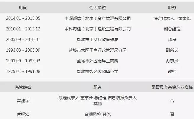 来看看中源诚信在协会的备案登记信息,该公司属于股权、创业投资基金,注册资本30000万元,实缴资本10000万元,注册实缴比例为33.33%,员工19人。公司两名高管均不具备基金从业资格,法定代表人瞿建军曾任中科海建(北京)建设工程有限公司副总经理,2014年起任中源诚信的董事长。