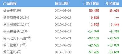 目前,叶飞旗下不少产品净值并没有因为两市行情回暖而有所表现。倚天投资还有7个产品处于运行状态。其中3个产品还维持着累计正收益,其余4个产品亏损均超过14%,最惨的“倚天雅莉4号”产品净值仅为0.4257。