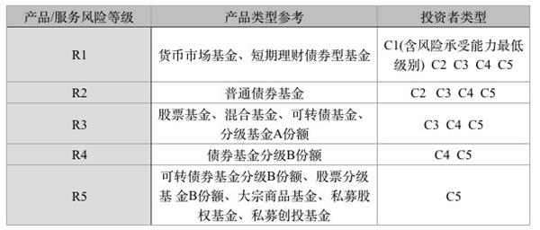 具体来看,《指引》制定了风险等级名录,按照基金产品的风险等级由低到高,划分了R1、 R2、 R3、 R4、R5 五个等级。同时,《指引》将投资者分为五个等级,按照风险承受能力,将普通投资者由低到高至少分为C1(含风险承受能力最低类别)、 C2、 C3、C4、 C5 五种类型。同时,《指引》对投资者等级和产品风险等级进行了匹配。