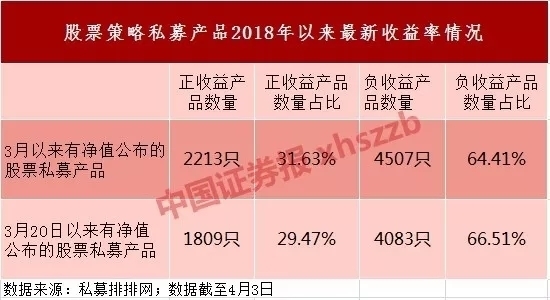 私募排排网的最新统计数据显示,截至4月3日,在2018年3月以来有最新净值数据公布的6997只股票策略私募基金产品中,有2213只产品取得正收益,占比仅为31.63%,相关产品算术平均收益率为4.10%。净值出现亏损的产品数量高达4507只,占比为64.41%,算术平均收益率为-6.29%。