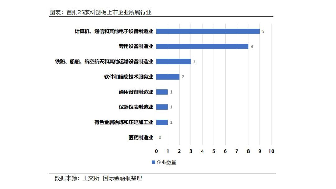 《国际金融报》记者发现,首批科创板上市企业“硬科技”属性明显。在25家科创板上市企业中,计算机、通信和其他电子设备制造业企业9家,专用设备制造业企业8家,铁路、船舶、航空航天和其他运输设备制造业企业3家,软件和信息技术服务业2家,通用设备制造业、仪器仪表制造业、有色金属冶炼和压延加工业企业均为1家。