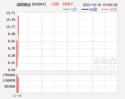 10月9日,洛阳钼业以8.7元跳空高开,终于在涨至9.33元时候被临时停牌至14:55分,而此时换手率达到80%。