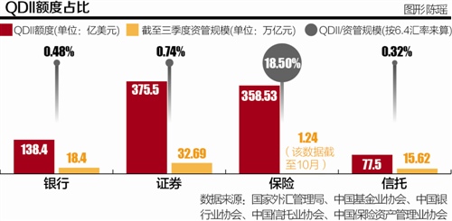 根据中国基金业协会、中国银行业协会、中国信托业协会和中国保险资产管理业协会分别公布的数据,截至三季度末,证券类资管(包括券商资管、基金及子公司、期货资管)规模为32.69万亿元,银行理财规模为18.4万亿元,信托受托规模为15.62万亿元,保险资管规模为1.24万亿元(截至10月份),合计67.95万亿元。按照人民币兑美元汇率6.4计算,QDII总额度占各类机构资管总规模不到1%。尤其是银行和信托,分类占比均不到0.5%,其中,银行QDII额度占银行资管规模比例为0.48%,而信托占比仅为0.32%。