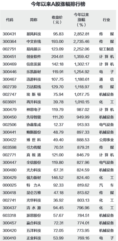 年内股价涨幅超5倍个股中,暴风科技涨幅居首,今年以来累计上涨近29倍,其次是中文在线、易尚展示,年内涨幅均在20倍以上。值得一提的是年内股价涨幅前三甲均被次新股牢牢占据,不仅如此,今年涨幅超5倍的个股中上市日期为今年的占比达85%。在当前三低发行、中签率低、新股体量小等大环境下,新股上市屡被爆炒,次新板块不断涌现大牛股成为新常态。