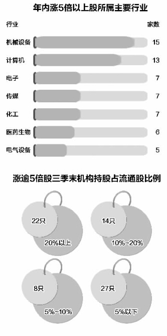 牛股频出离不开机构资金的参与。数据宝统计显示,年内涨幅5倍以上个股中,机构三季末共持有71只,其中半数股票三季度末获5家以上机构集中持有,如,吉祥航空三季度末前十大流通股东席位被机构包揽,全信股份被多只国家队资管计划相中。从三季度末机构持股比例看,机构对火炬电子仓位最重,三季度末控盘比例达50%以上,三季末机构持股量占流通股比例20%以上的也有春秋航空、中文在线等21只。(余莉)