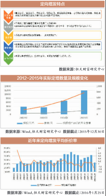 Wind数据显示,截至12月30日,A股市场2015年完成定增数量772次,较2012年增长220%;实际募集资金规模1.19万亿元,较2012年增长373.6%。定向增发作为融资方式的一种,在资本市场的重要程度正逐渐增强,预计这一加速趋势还将延续。同时,定向增发的门槛依旧维持在高水平,融资规模超过20亿元的定增项目逐渐增加,目前约占整个定增市场的20%,单笔超2亿元的高门槛让许多投资者望而却步。尤其是在2015年国企改革的大背景下,很多央企定增都开出了单笔5亿元甚至以上超大单,个人投资者参与定向增发需要借助机构来完成。